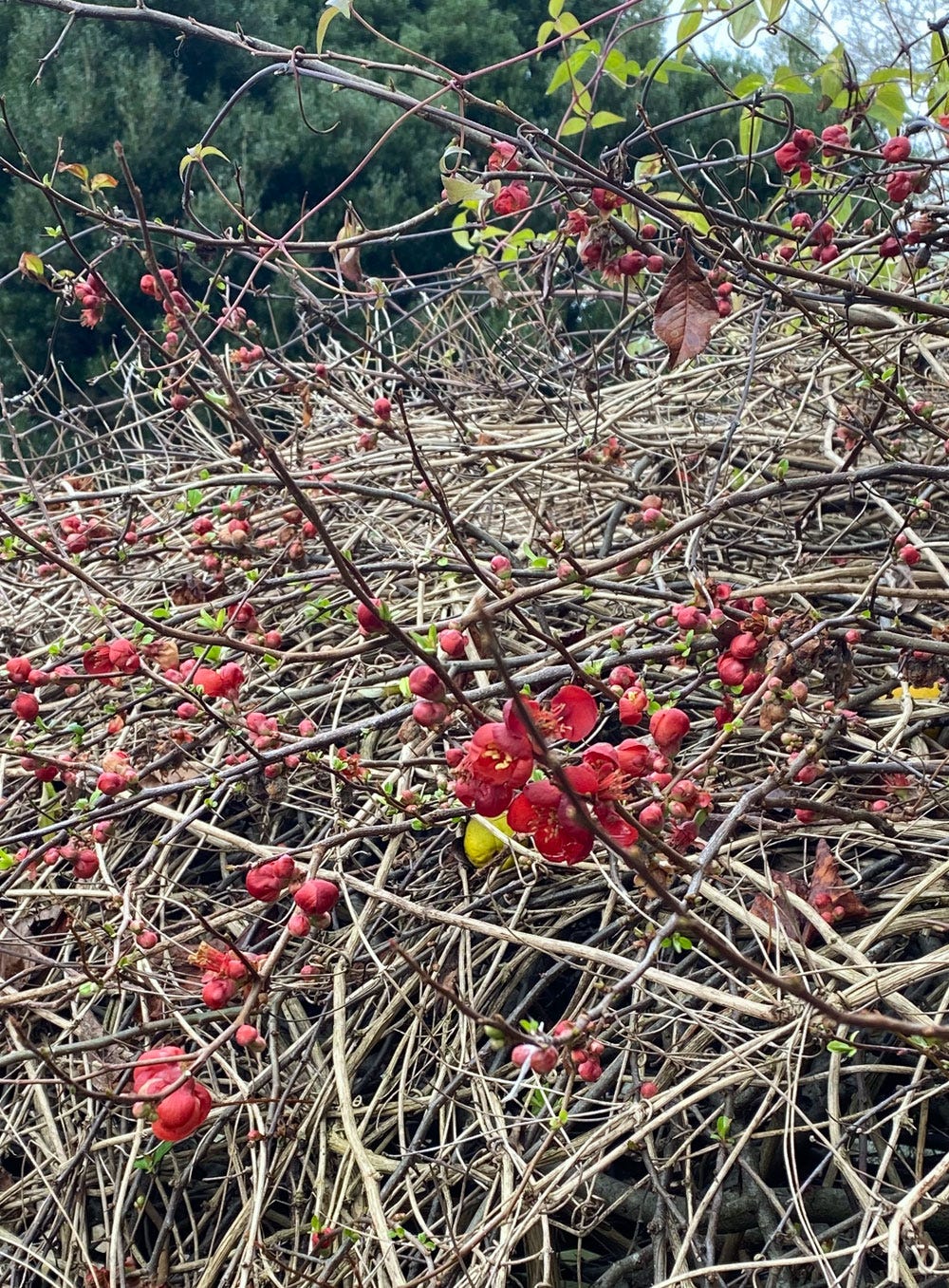 Below are more blossoms that stopped me in my tracks on my way home one day. It looks like they belong to the Japanese quince (though I’m by no means certain of this identification).