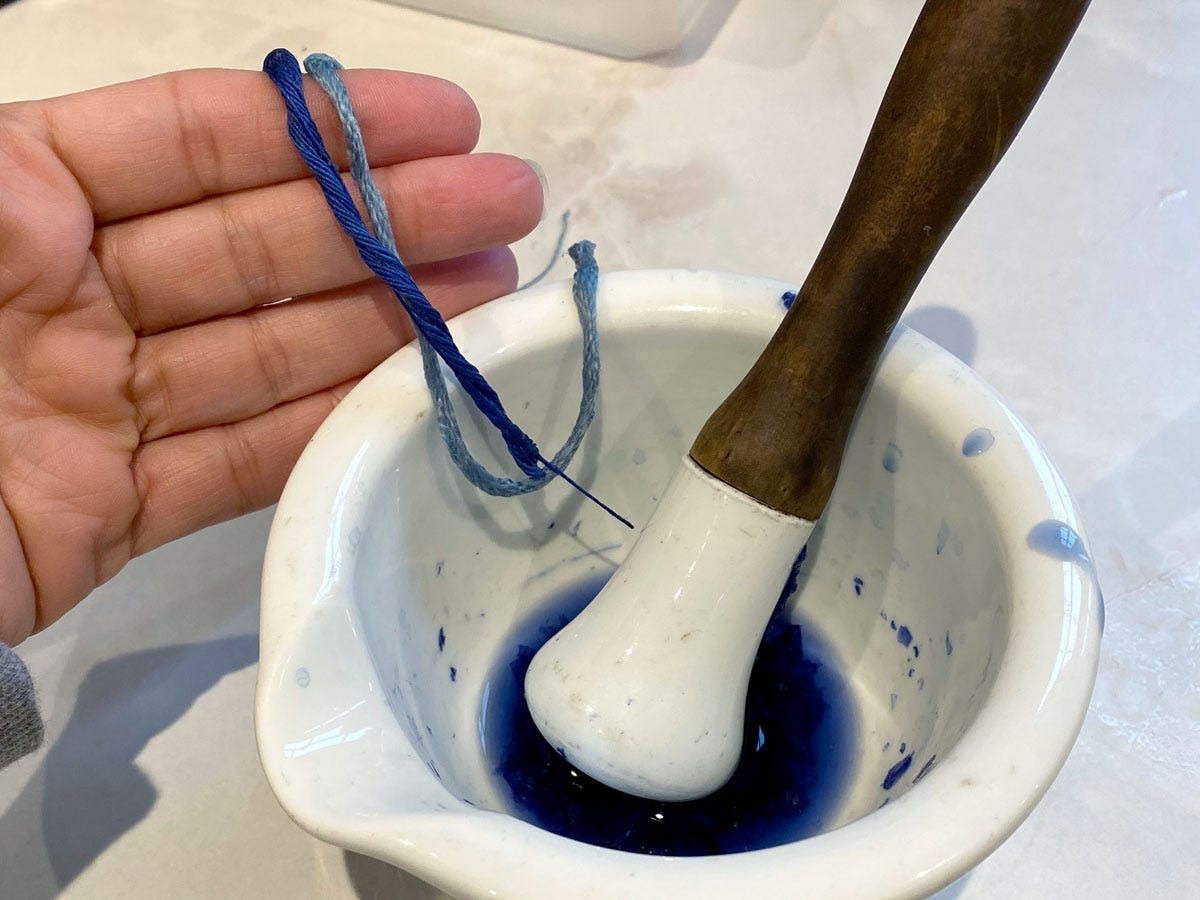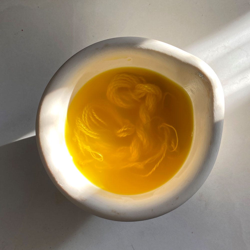 Daffodils make an excellent yellow, particularly when laked: the lemon yellow warms up to a golden yolk. So I sprinkled a tiny amount of soda ash into the mortar to deepen the hue.