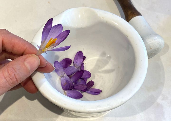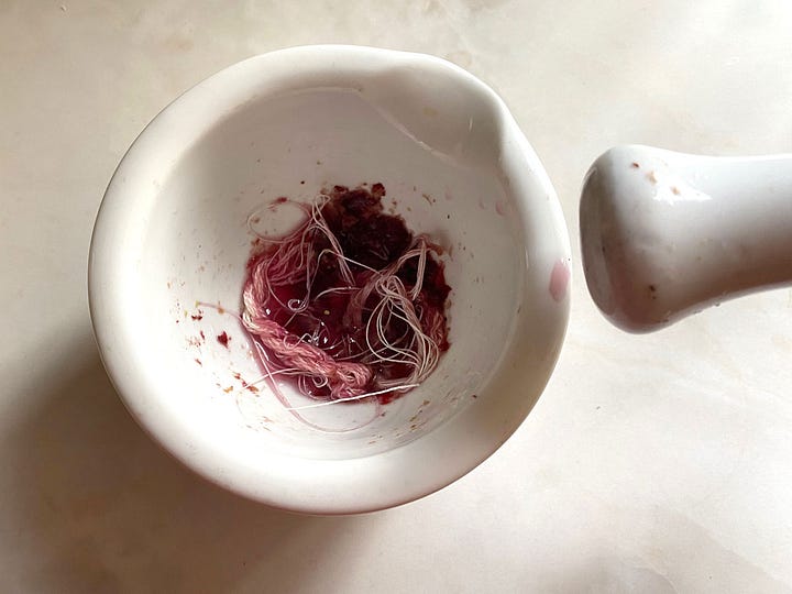 This lawn of crocuses charmed me, and then I wondered if any colour could be coaxed out of them. I knew from experience that covering them in water would just destroy the biochrome, so Icrushed them instead, and pounded the fibres directly in the mortar.