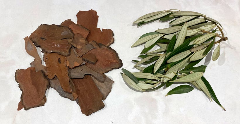 While in Beirut, I also picked up bark from Mediterranean stone pines (Pinus pinea) growing on the campus of my alma mater. Unlike more northerly species, they shed their bark in large smooth flakes, some the size of my hand, so the bark is available without hurting the tree.