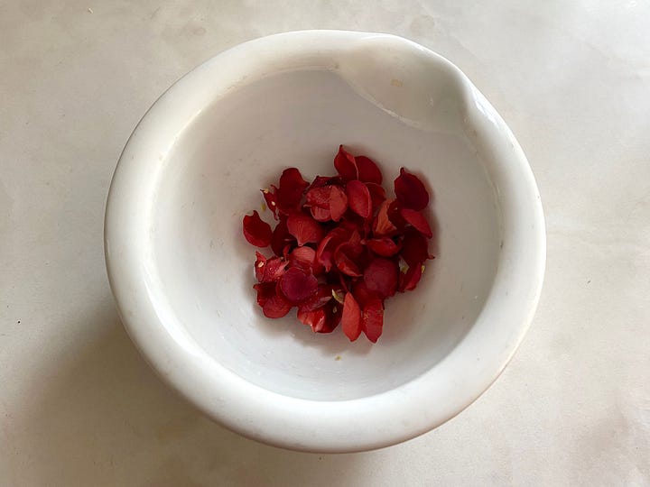 We had family staying at Christmas and I set them to work cracking a bag of pecans in the shell from my grandfather’s garden. The shells produced a lovely brown that now I look at it again, is really an old rose hue.